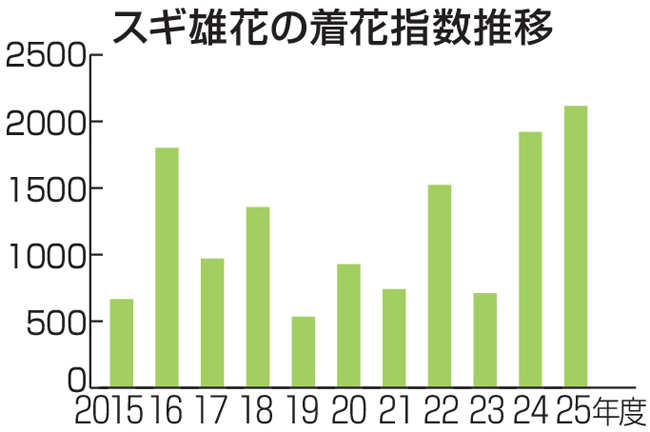 昨年11月13日〜12月1日に県内30カ所のスギ林で、職員が約2400本の雄花の着花状況を目視で調べた。今回調査の着花指数は2124。過去10年の平均(1124)を上回り、昨春と比べても1.1倍になった。昨夏の記録的な猛暑や長い日照時間が雄花の形成を促したとみられる。