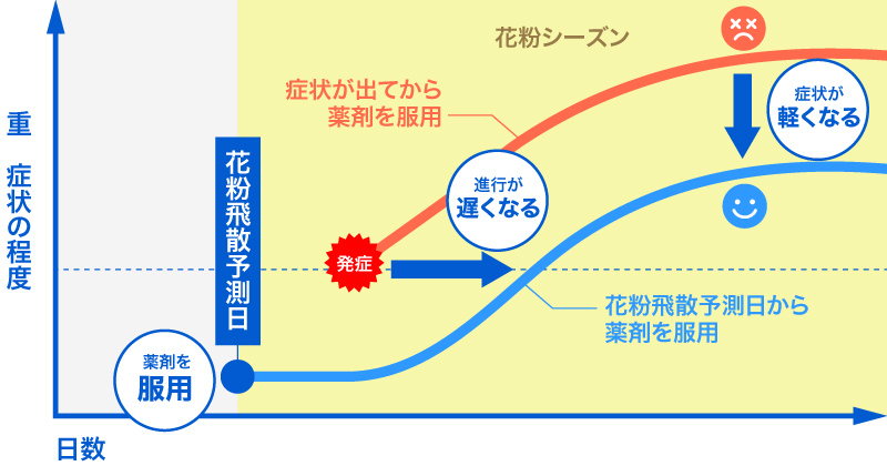 一度症状が出てしまうと鼻の粘膜がどんどん敏感になり、悪化していきますので、症状がひどくなる前から早めの治療をおすすめします。花粉の飛散予測日から、第2世代抗ヒスタミン薬などの経口治療薬を前もって飲み始めることで発症時期を遅らせ、花粉が飛ぶ最盛期の症状を軽くする効果が期待できます。